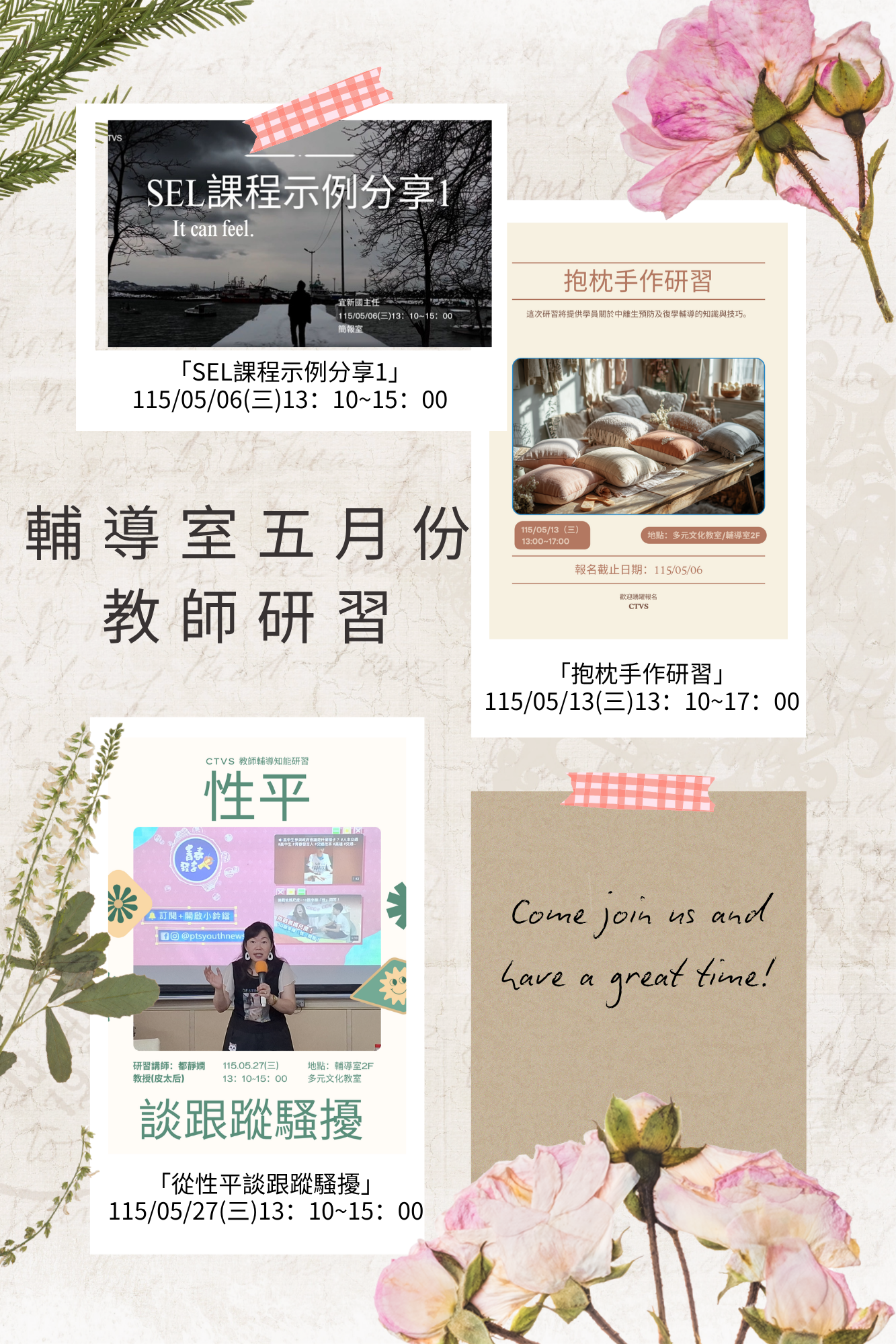 📍研習名稱:「談SEL教職員情緒健康」 📍研習日期及時間:115/04/15(三)13:10~15:00 📍研習講師:都靜嫻教授(皮太后) 📍地點:活動中心 📍研習時數及內容:2小時。辦理學校第一線人員心理健康相關議題之增能活動。 |